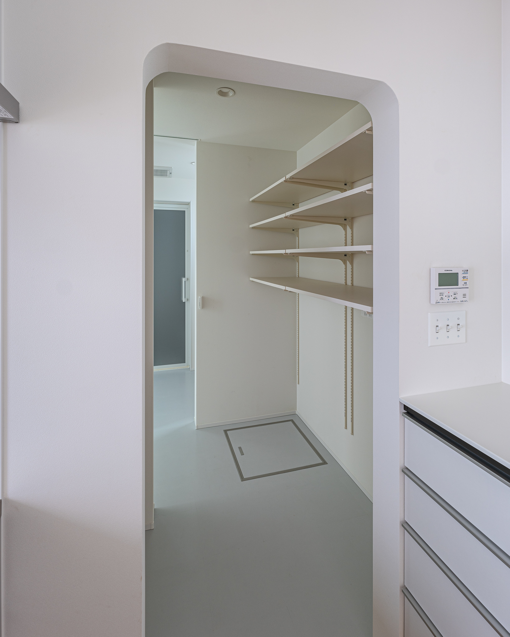 キッチン・パントリー・ランドリーが一直線につながる間取りで、