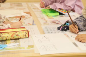 商品カードに色を塗る時間では、みんなとても集中して、一生懸命ていねいに色を塗っていました。